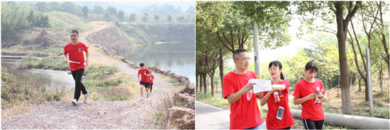 首先進(jìn)行的是一項(xiàng)新興戶外運(yùn)動(dòng)—定向越野挑戰(zhàn)賽,這不僅需要有充沛的體能,跑遍景區(qū)每個(gè)角落打卡12個(gè)計(jì)時(shí)點(diǎn),而且只能依靠地圖、指南針在完全陌生的景區(qū)樹林中搜索打卡點(diǎn)。全程完賽微信步數(shù)達(dá)到1萬步,相當(dāng)于跑了10公里山路。這比賽強(qiáng)度不是專業(yè)運(yùn)動(dòng)員才能勝任嗎?我們的隊(duì)員能完成嗎?事實(shí)完全擊碎了賽前的質(zhì)疑,我們的隊(duì)員全部在一個(gè)半小時(shí)內(nèi)完成了挑戰(zhàn),最快時(shí)間只用了三十一分鐘,你們穿過荊棘,輕傷不下火線,你們合理運(yùn)用規(guī)則,研究最優(yōu)路線,簡直是力量與智慧的化身,連教練都由衷為你們點(diǎn)贊。